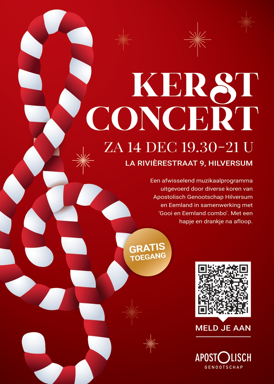 Kom genieten van een afwisselend muzikaal programma tijdens het Kerstconcert in Hilversum. Diverse koren van het Apostolisch Genootschap Hilversum en Eemland brengen in samenwerking met 'Gooi en Eemland combo' een diversiteit aan muziekstukken ten gehore. Van 'Hark the herald-angels sing' tot 'Why we sing'.